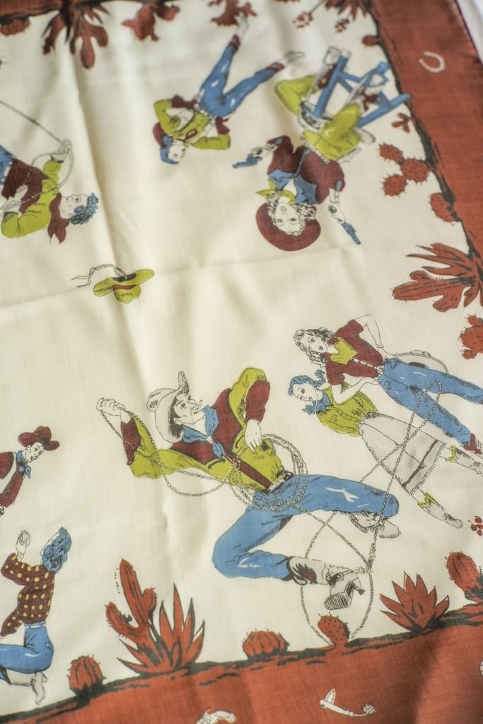 躍動的なカウボーイとカウガールが描かれており、フレンチらしい黄土色とナチュラルカラーとのコントラストが美しいデザインです。