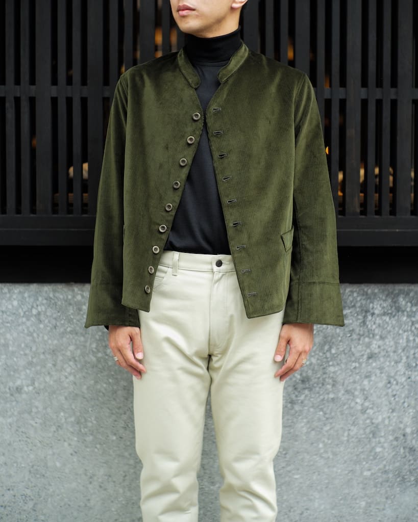 生地はイギリス製のコットン100%コーデュロイ。HEAVY CORDUROY が8ウェルなのに対し、 BABY DORDUROY は12ウェルとなっており、ライトで柔らかな生地感です。※ウェルは、1インチ(約2.54cm)の中に畝が何本あるかの数値